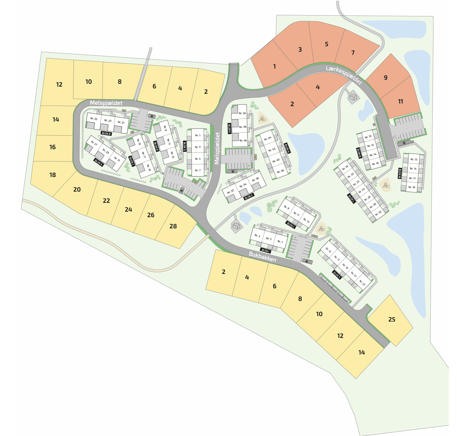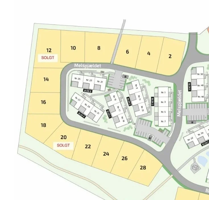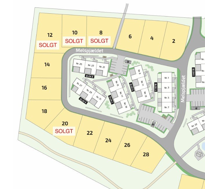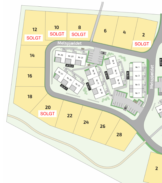 De gule parcelhusgrunde på Melspjældet er udbudt til salg ved EDC Poul Erik Bech Roskilde